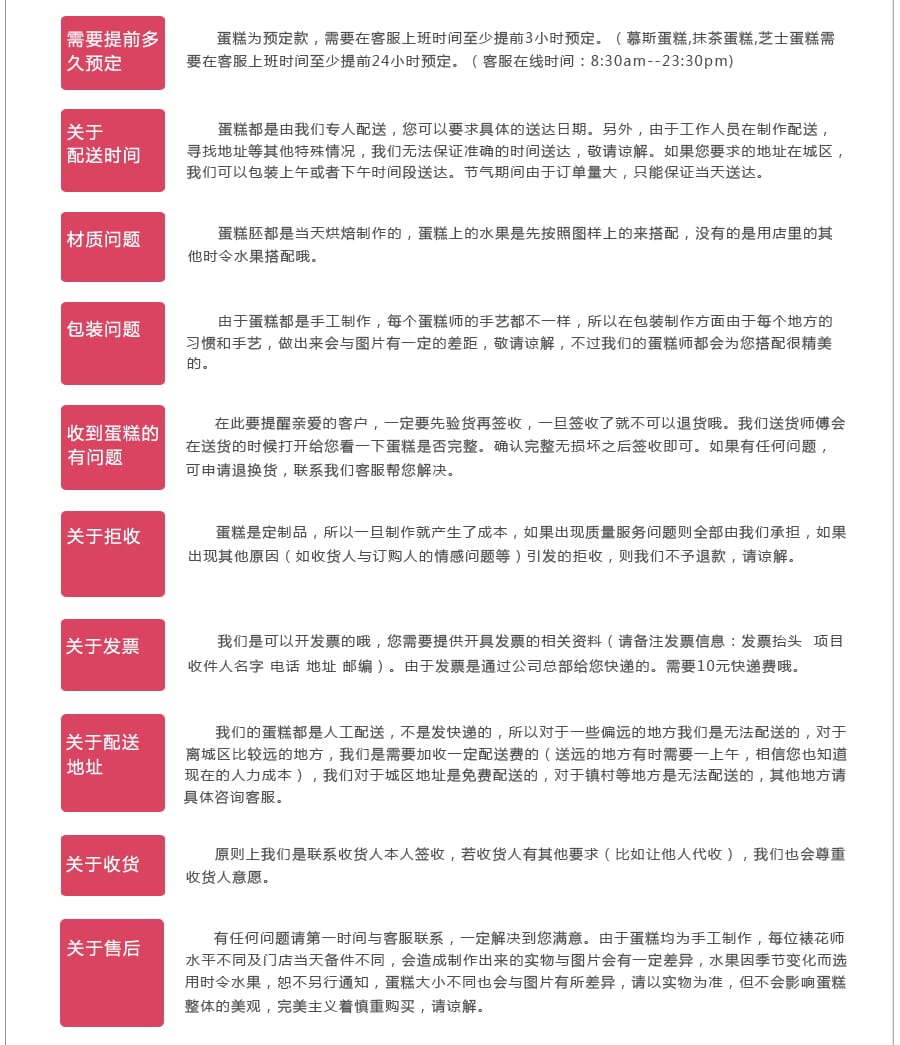 :送花时间8:30-19:00;按照客户指定的时间段送达,但不保证准点;所有产品均送货上门;全国所有的大中城市,90%以上的郊区、县城及乡镇;市区内、县城内免费送花上门。
