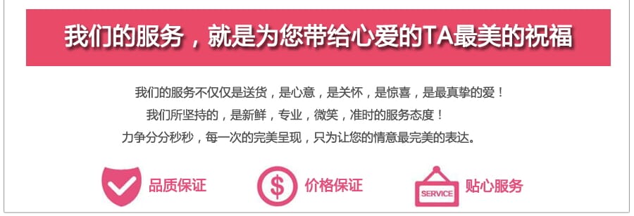 【材质替换】:由于地区和季节及其它特殊原因的限制,如果有些花材或颜色在当时没有,我们会及时联系订货人确定其它花材。如订单紧急,我们在不影响您所选的鲜花效果的情况下,按照寓意相同、类似花材、价值相同替代原则代替,希望您能谅解。